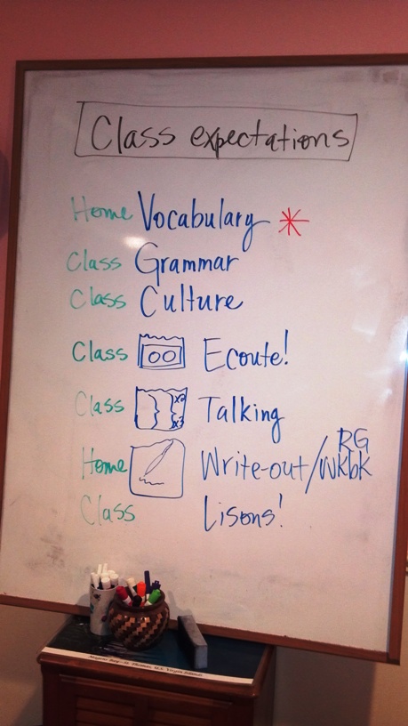 Our expectations were clarified to start off the year with success: In class = all listening/speaking (face) exercises, De antemano, Panorama cultural, Gramática, All write-out (pen), Nota cultural, Encuentro cultural, Letra y sonido, Más práctica gramatical, Vocabulario, Examencitos, y Exámenes. At home = Review (Don't study) :)